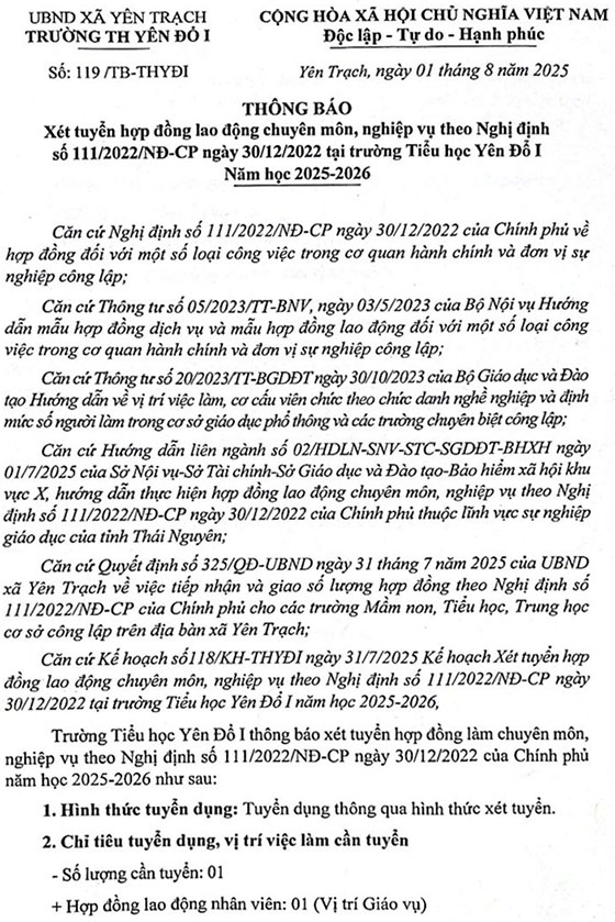 Trường TH Yên Đổ I, xã Yên Trạch, Thái Nguyên tuyển hợp đồng làm chuyên môn, nghiệp vụ theo Nghị định số 111/2022/NĐ-CP năm học 2025-2026