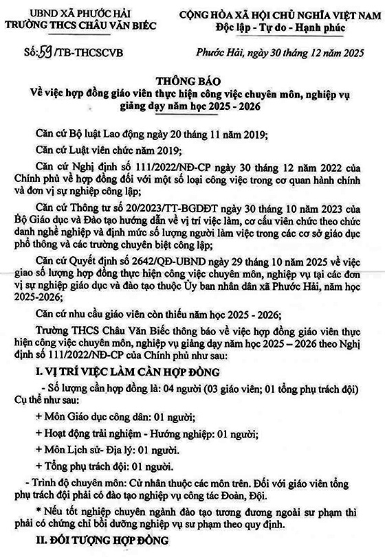 Trường THCS Châu Văn Biếc, xã Phước Hải, TP HCM thông báo tuyển dụng giáo viên hợp đồng giảng dạy năm học 2025 – 2026.