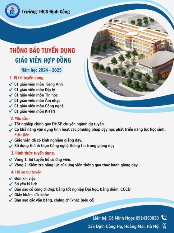 Trường THCS Định Công, phường Định Công, TP. Hà Nội tuyển dụng giáo viên hợp đồng năm học 2024-2025