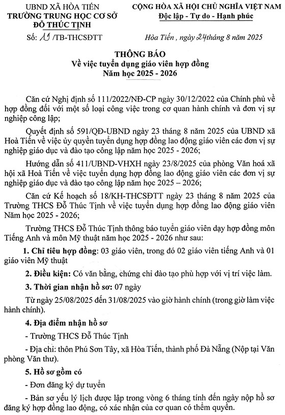 Trường THCS Đỗ Thúc Tịnh, xã Hòa Tiến, TP. Đà Nẵng tuyển dụng giáo viên dạy hợp đồng năm học 2025 – 2026