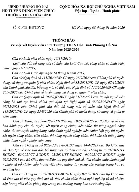 Trường THCS Hòa Bình, phường Hố Nai thông báo tuyển dụng viên chức năm học 2025-2026, cụ thể như sau: