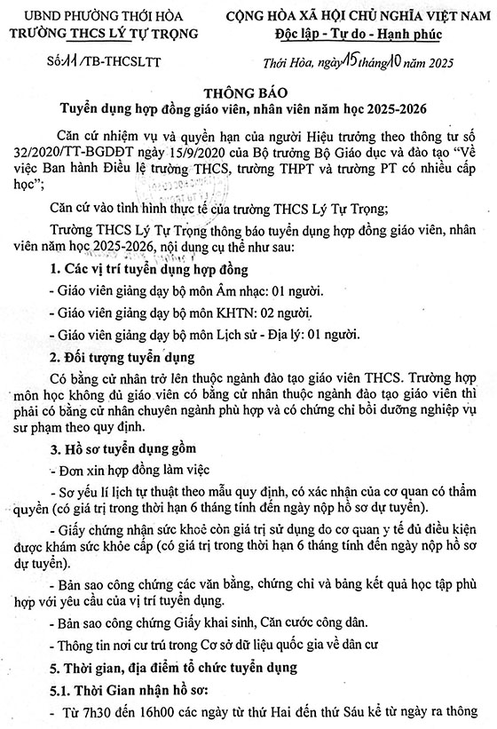 Trường THCS Lý Tự Trọng, phường Thới Hòa, TP. HCM tuyển dụng HĐ giáo viên, nhân viên năm học 2025-2026, nội dụng cụ thể như sau: