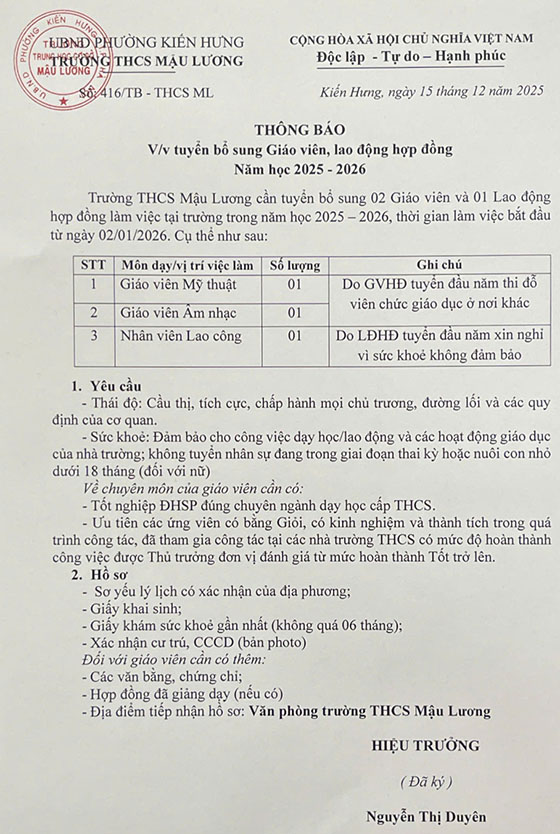 Trường THCS Mậu Lương cần tuyển bổ sung 02 Giáo viên và 01 Lao động hợp đồng làm việc tại trường trong năm học 2025 – 2026, thời làm việc bắt đầu từ ngày 02/01/2026. Cụ thể như sau: