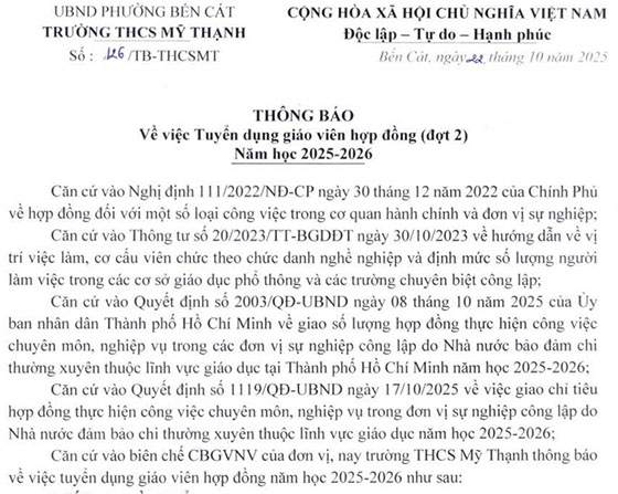 Trường THCS Mỹ Thạnh, phường Bến Cát, TP. HCM tuyển dụng giáo viên hợp đồng năm học 2025 -2026