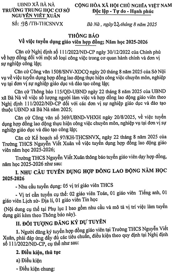 Trường THCS Nguyễn Viết Xuân, xã Bà Nà, Đà Nẵng tuyển dụng LĐHĐ năm học 2025 – 2026