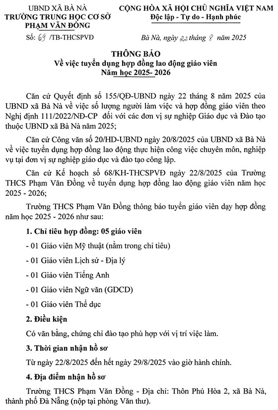 Trường THCS Phạm Văn Đồng, xã Bà Nà, TP. Đà Nẵng tuyển dụng giáo viên dạy hợp đồng năm học 2025 – 2026