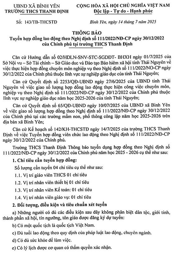 Căn cứ Kế hoạch số 142/KH-THCSTĐ ngày 14/7/2025 của trường THCS Thanh Định về việc Tuyển hợp đồng viên chức lao động theo Nghị định số 111/2022/NĐ-CP ngày 30/12/2022 của Chính phủ. Trường THCS Thanh Định Thông báo tuyển dụng hợp đồng theo Nghị định số 111/2022/NĐ-CP ngày 30/12/2022 của Chính phủ năm học 2025 – 2026 cụ thể như sau: