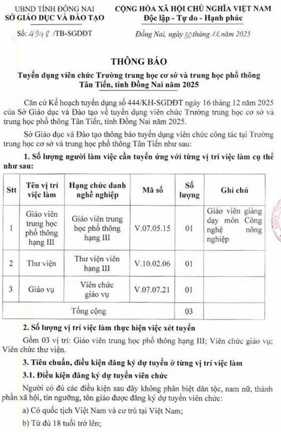 Sở Giáo dục và Đào tạo thông báo tuyển dụng viên chức công tác tại Trường trung học cơ sở và trung học phổ thông Tân Tiến như sau: