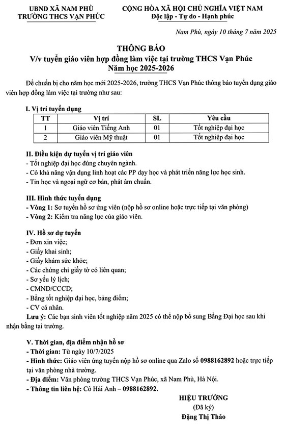 Chuẩn bị cho năm học mới 2025-2026, trường THCS Vạn Phúc thông báo tuyển dụng giáo viên hợp đồng làm việc tạ trường như sau: