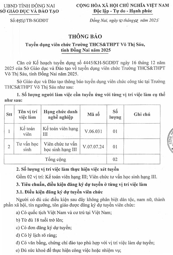 Sở Giáo dục và Đào tạo thông báo tuyển dụng viên chức công tác tại Trường THCS&THPT Võ Thị Sáu như sau: