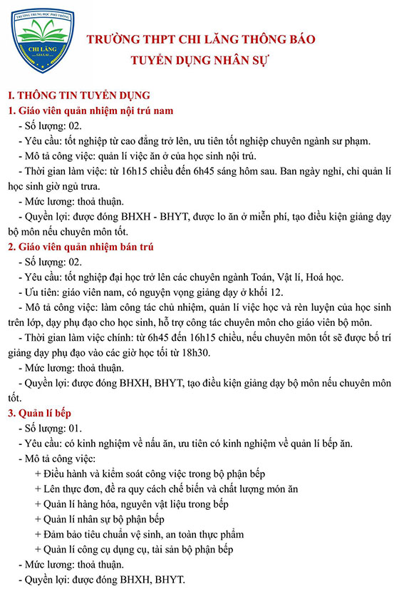 Trường THPT Chi Lăng thông báo tuyển dụng nhân sự năm 2025, cụ thể như sau: