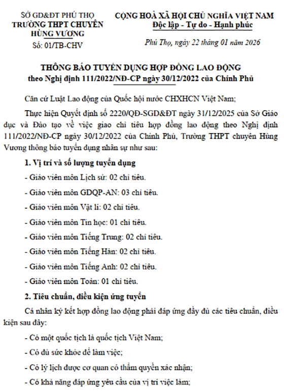 Trường THPT chuyên Hùng Vương thông báo tuyển dụng nhân sự như sau: