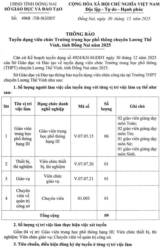 Sở GD&ĐT thông báo tuyển dụng viên chức công tác tại Trường THPT chuyên Lương Thế Vinh như sau: