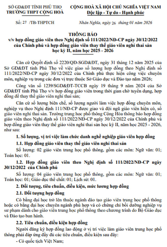 Trường trung học phổ thông Cộng Hòa thông báo hợp đồng giáo viên theo Nghị định số 111/2022/NĐ-CP ngày 30/12/2022 của Chính phủ và hợp đồng giáo viên thay thế giáo viên nghỉ thai sản học kỳ II, năm học 2025 – 2026, như sau: