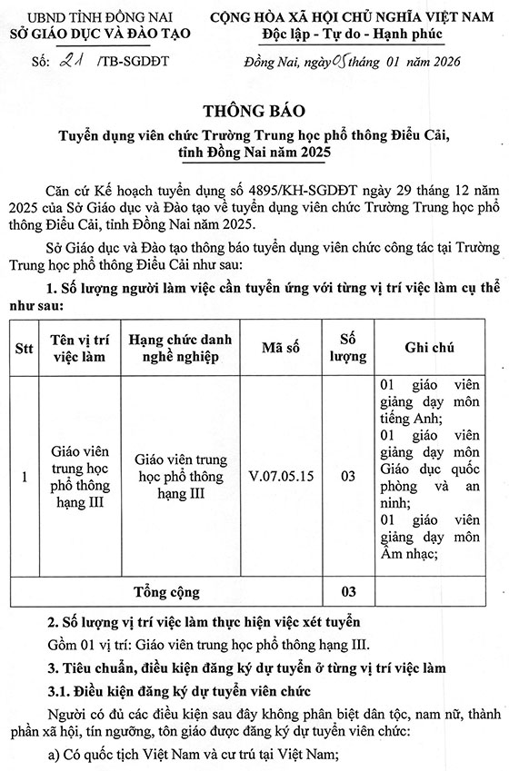 Căn cứ nhu cầu giáo viên, nhân viên Trường THPT Điểu Cải năm học 2025- 2026, Sở Giáo dục và Đào tạo xây dựng kế hoạch tuyển dụng viên chức Trường THPT Điểu Cải như sau: