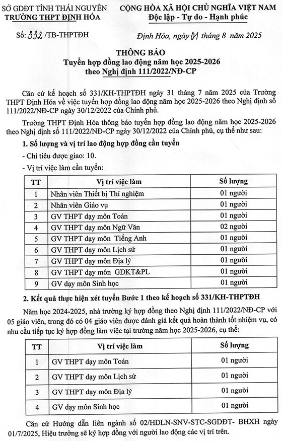 Trường THPT Định Hóa thông báo tuyển hợp đồng lao động năm học 2025-2026 theo Nghị định số 111/2022/NĐ-CP ngày 30/12/2022 của Chính phủ, cụ thể như sau: