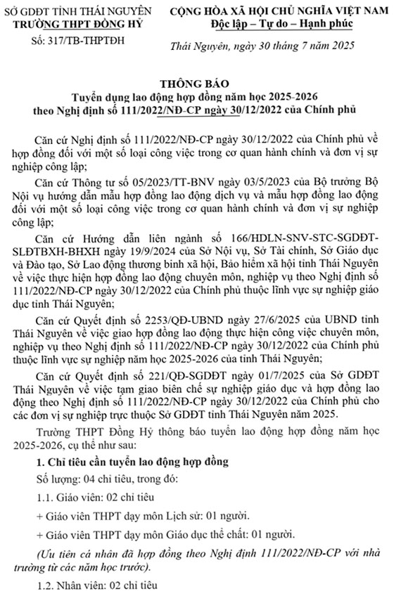 Trường THPT Đồng Hỷ thông báo tuyển lao động hợp đồng năm học 2026, cụ thể như sau: