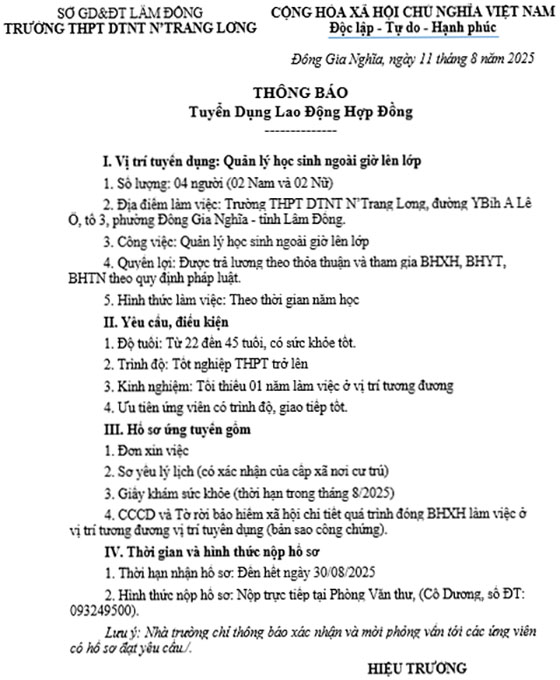 Trường THPT DTNT’Trang Lơng tuyển dụng lao động hợp đồng, cụ thể như sau:
