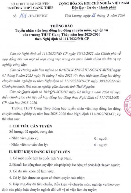 Trường THPT Gang Thép thông báo tuyển nhân viên hợp đồng lao động chuyên môn, nghiệp vụ năm học 2025-2026 theo Nghị định 111/2022/NĐ-CP, cụ thể như sau: