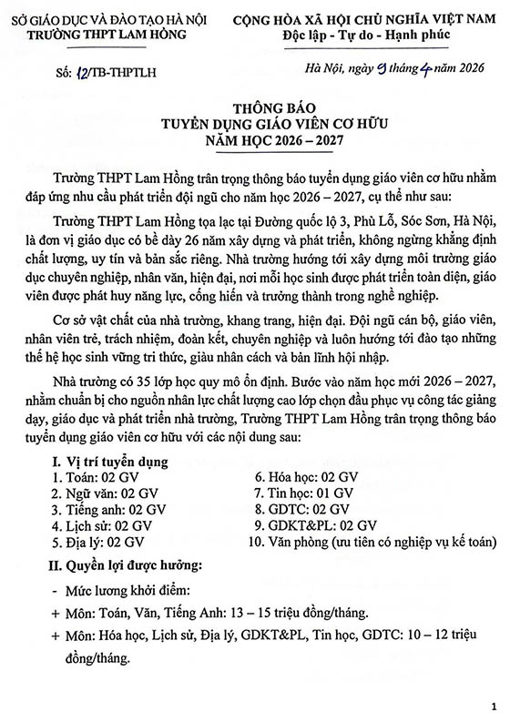Trường THPT Lam Hồng tuyển dụng giáo viên cơ hữu cho năm học 2026–2027, cụ thể: