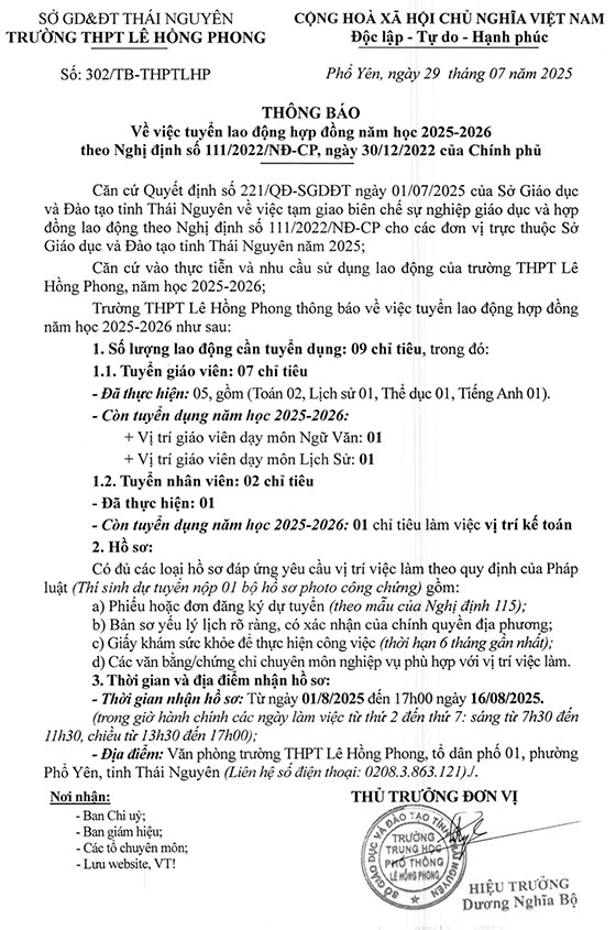 Trường THPT Lê Hồng Phong, phường Phổ Yên, tỉnh Thái Nguyên tuyển dụng LĐHD năm học 2025-2026