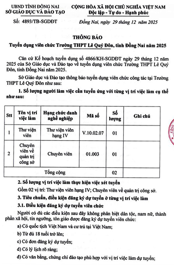 Trường THPT Lê Quý Đôn, tỉnh Đồng Nai tuyển dụng viên chức năm 2025, như sau: