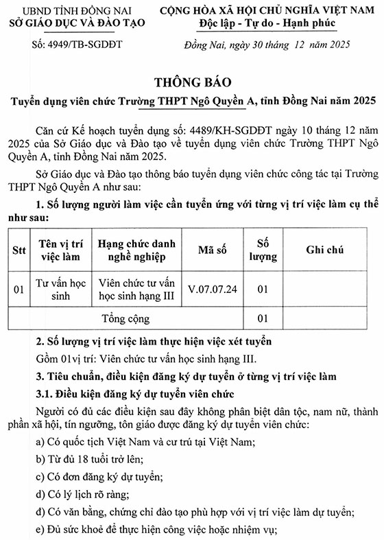 Trường THPT Ngô Quyền A, Đồng Nai tuyển dụng viên chức