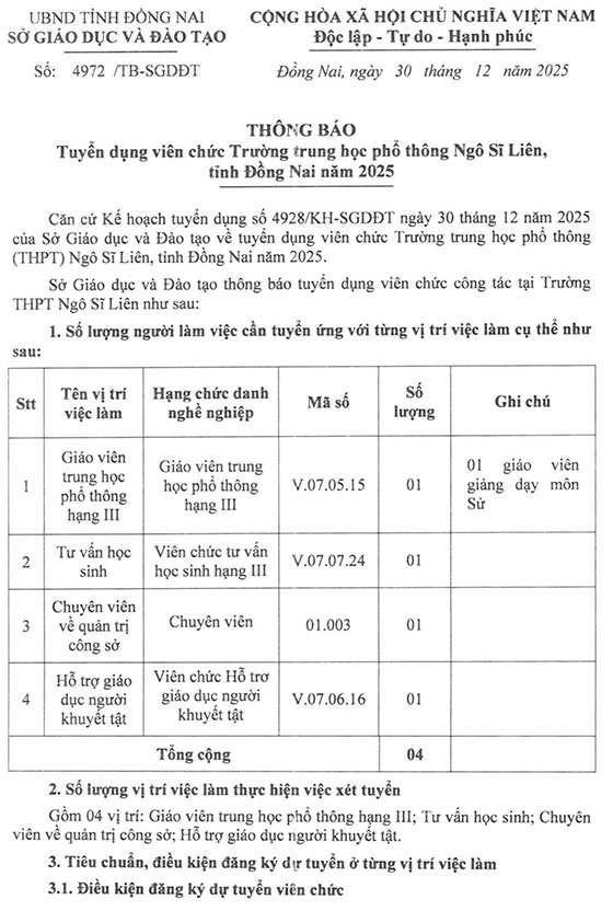 Thông báo tuyển dụng viên chức Trường trung học phổ thông Ngô Sĩ Liên, tỉnh Đồng Nai – năm 2025, cụ thể như sau: