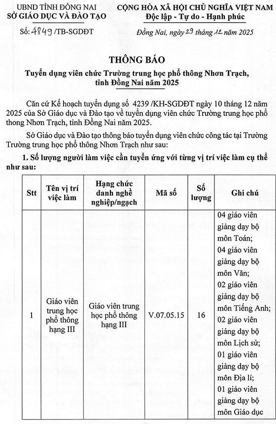 Sở Giáo dục và Đào tạo thông báo tuyển dụng viên chức công tác tại Trường Trường trung học phổ thông Nhơn Trạch như sau: