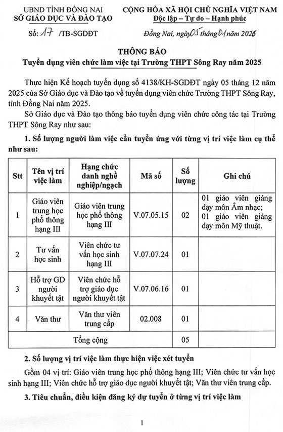 Sở Giáo dục và Đào tạo thông báo tuyển dụng viên chức công tác tại Trường THPT Sông Ray như sau: