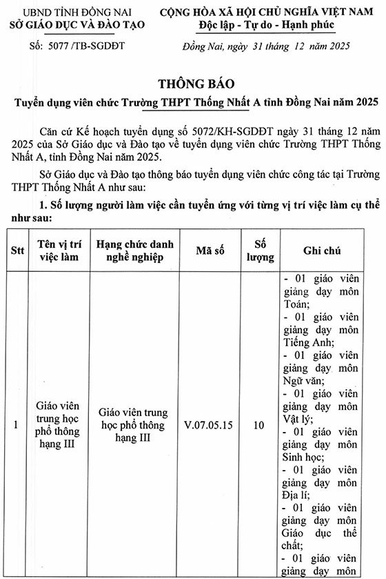 Trường THPT Thống Nhất A thông báo tuyển dụng viên chức năm học 2025-2026, cụ thể như sau: