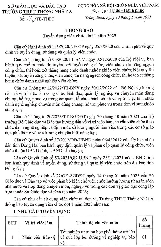 Căn cứ nhu cầu sử dụng viên chức tại đơn vị, Trường THPT Thống Nhất A thông báo tuyển dụng viên chức đợt 1 năm 2025 như sau: