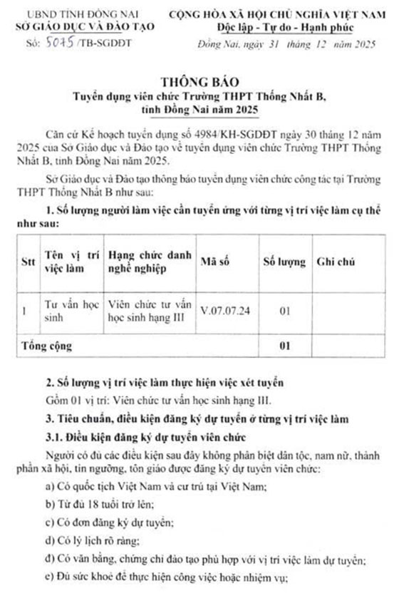 Trường THPT Thống Nhất B, Đồng Nai tuyển dụng viên chức