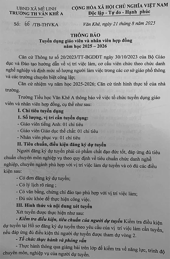 Trường Tiểu học Văn Khê A thông báo về việc tổ chức tuyển dụng giáo viên và nhân viên hợp đồng, cụ thể như sau: