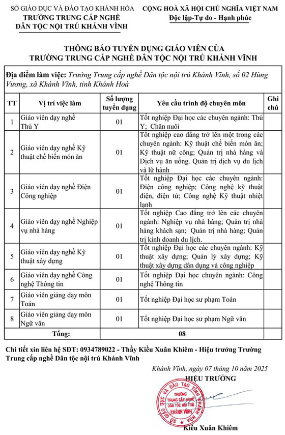 Trường Trung cấp nghề Dân tộc nội trú Khánh Vĩnh, Khánh Hòa tuyển dụng giáo viên
