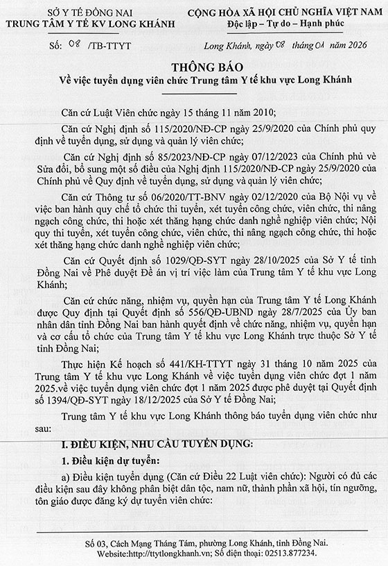 Căn cứ kế hoạch xét tuyển viên chức đã được Sở Y tế Đồng Nai phê duyệt, Trung tâm Y tế khu vực Long Khánh thông báo tuyển dụng viên chức làm việc tại đơn vị, cụ thể như sau: