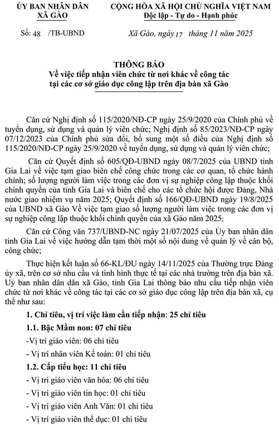 Thực hiện kết luận số 66-KL/ĐU ngày 14/11/2025 của Thường trực Đảng ủy xã, trên cơ sở nhu cầu và tình hình thực tế tại các nhà trường trên địa bàn xã. Uỷ ban nhân dân xã Gào, tỉnh Gia Lai thông báo nhu cầu tiếp nhận viên chức từ nơi khác về công tác tại các cơ sở giáo dục công lập trên địa bản xã, cụ thể như sau:
