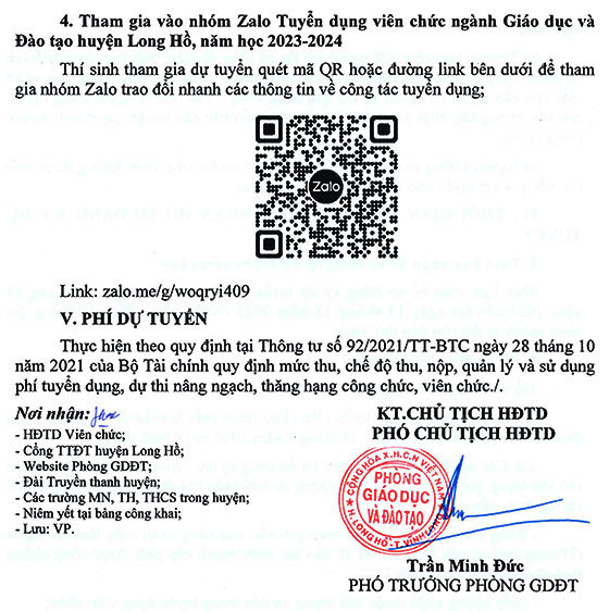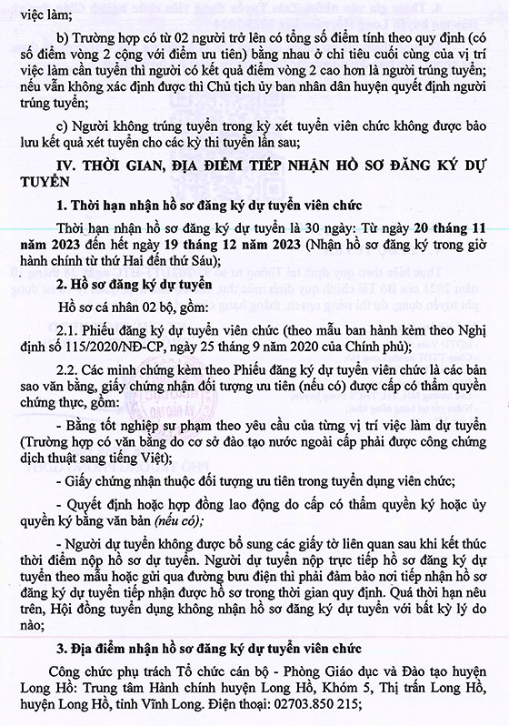 – Địa điểm: Công chức phụ trách Tổ chức cán bộ – Phòng Giáo dục và Đào tạo huyện Long Hồ: Trung tâm Hành chính huyện Long Hồ, Khóm 5, Thị trấn Long Hồ, huyện Long Hồ, tỉnh Vĩnh Long. Điện thoại: 02703.850 215;