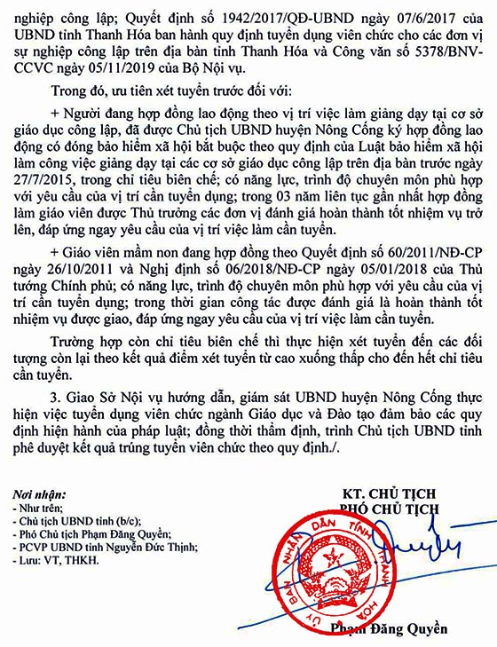 Theo đó, Chủ tịch UBND tỉnh đồng ý với kế hoạch tuyển dụng viên chức ngành Giáo dục và Đào tạo thuộc UBND huyện Nông Cống; Giao Chủ tịch UBND huyện Nông Cống xây dựng phương án và thực hiện tuyển dụng viên chức đảm bảo theo đúng trình tự, thủ tục, thời gian quy định với các nội dung chính sau: