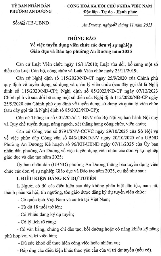 Ủy ban nhân dân (UBND) phường An Dương thông báo tuyển dụng viên chức các đơn vị sự nghiệp Giáo dục và Đào tạo năm 2025, cụ thể như sau: