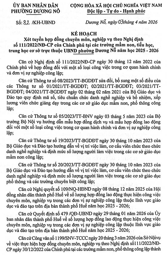 Để đảm bảo việc tổ chức dạy và học năm học 2025 – 2026, Ủy ban nhân dân phường Dương Nỗ xây dựng Kế hoạch xét tuyển hợp đồng giáo viên theo Nghị định số 111/2022/NĐ-CP của Chính phủ, năm học 2025 – 2026, cụ thể như sau: