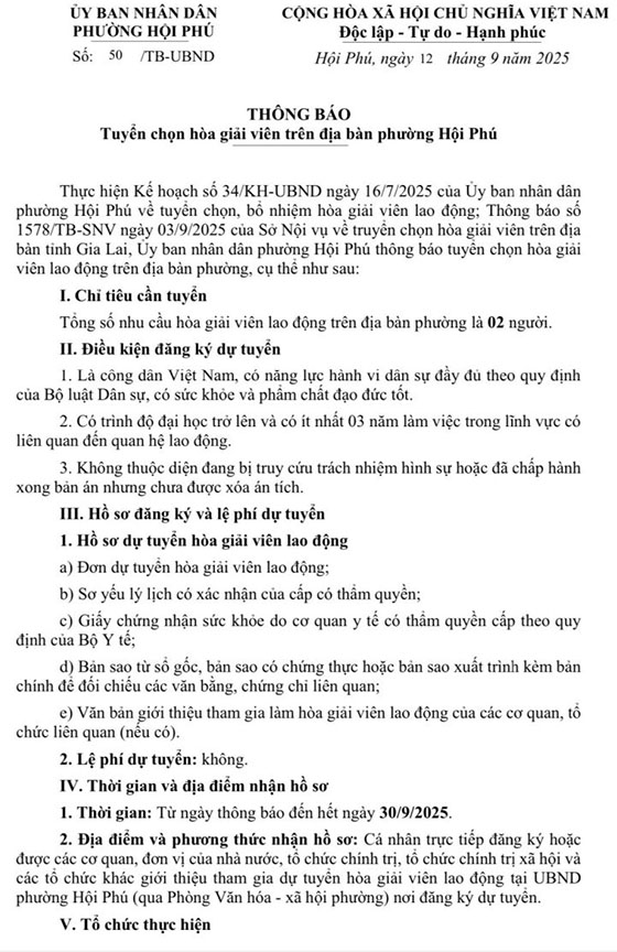 Ủy ban nhân dân phường Hội Phú thông báo tuyển chọn hòa giải viên lao động trên địa bàn phường, cụ thể như sau: