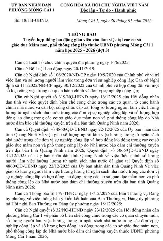 Uỷ ban nhân dân phường Móng Cái 1 thông báo nhu cầu tuyển hợp đồng lao động giáo viên vào làm việc tại các cơ sở giáo dục Mầm non, phổ thông công lập thuộc UBND phường năm học 2025 – 2026 (đợt 3) như sau: