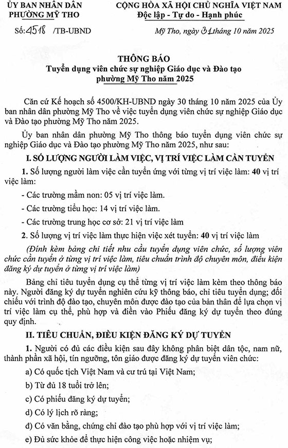 Ủy ban nhân dân phường Mỹ Tho thông báo tuyển dụng viên chức sự nghiệp Giáo dục và Đào tạo phường Mỹ Tho năm 2025, như sau: