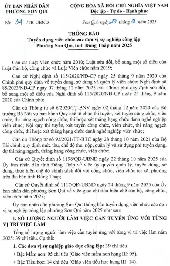 Ủy ban nhân dân phường Sơn Qui thông báo tuyển dụng viên chức các đơn vị sự nghiệp công lập phường Sơn Qui năm 2025 như sau: