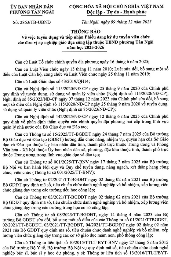 UBND phường Tân Ngãi (UBND phường) thông báo tuyển dụng và tiếp nhận Phiếu đăng ký dự tuyển viên chức các đơn vị sự nghiệp giáo dục công lập thuộc UBND phường năm học 2025-2026, cụ thể như sau: