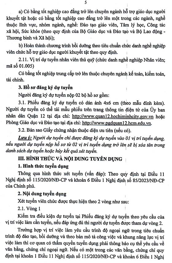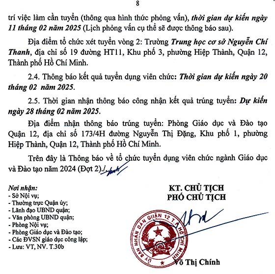 UBND Quận 12, TP. HCM tuyển dụng viên chức ngành Giáo dục và Đào tạo năm 2024 (Đợt 2), như sau: