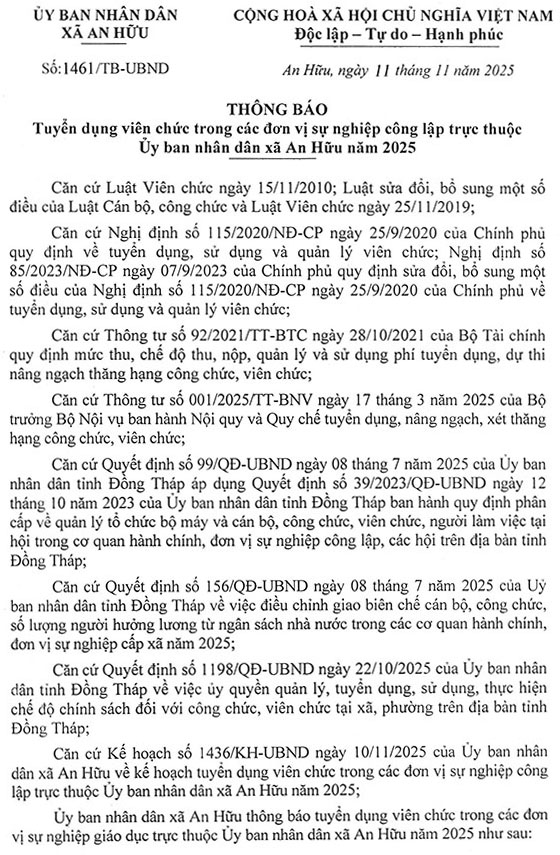 Ủy ban nhân dân xã An Hữu thông báo tuyển dụng viên chức trong các đơn vị sự nghiệp giáo dục trực thuộc Ủy ban nhân dân xã An Hữu năm 2025 như sau: