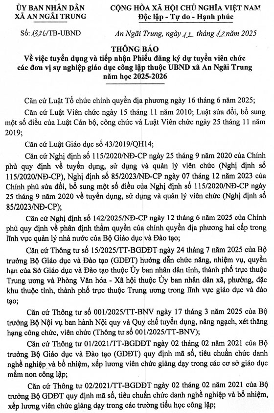 Ủy ban nhân dân xã An Ngãi Trung thông báo tuyển dụng và tiếp nhận Phiếu đăng ký dự tuyển viên chức các đơn vị sự nghiệp giáo dục công lập thuộc UBND xã năm học 2025-2026, cụ thể như sau: