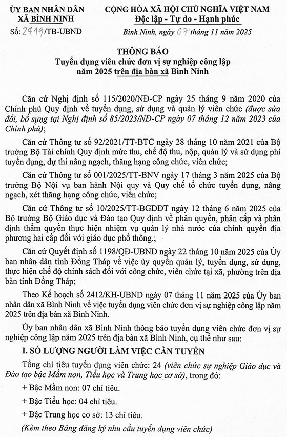 Ủy ban nhân dân xã Bình Ninh thông báo tuyển dụng viên chức đơn vị sự nghiệp công lập năm 2025 trên địa bản xã Bình Ninh, cụ thể như sau:
